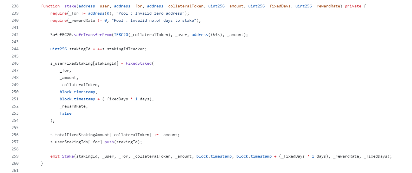 The core logic of staking tokens is executed inside the _stake function. Here is the code :