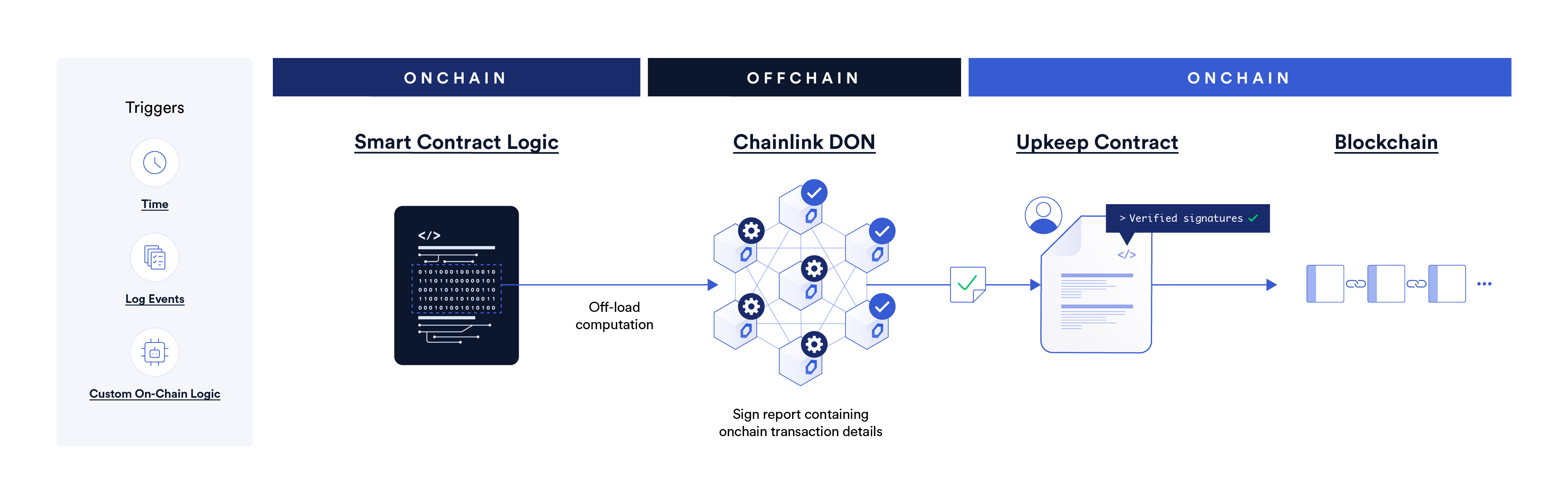 - Custom logic trigger: Use a custom logic trigger to provide custom solidity logic that Automation Nodes evaluate (offchain) to determine when to execute your function onchain.