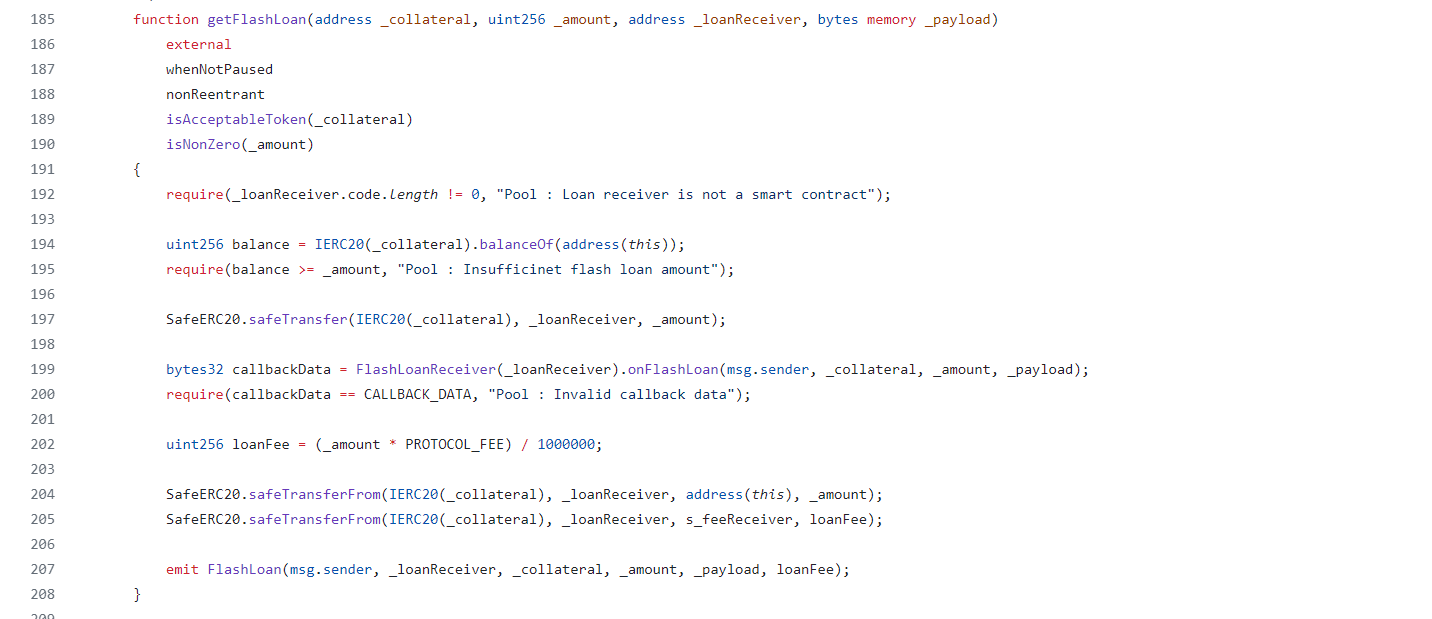 - After that at line 204, 205 pool recollect the sended tokens with fee of 0.3%, The fee is send to fee receive adddress and flash-loan amount is sended to pool.